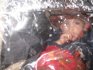 Here's my crew all bundled up and protected from the elements while waiting for Easton's bus to arrive. We saw our first snowflakes falling fast to the ground among the drizzling rain!