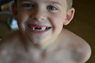 Easton's dangling tooth and it's neighbor finally let go tonight! They've been torturing Ryan for months now - yes, I said RYAN! Just about every day Ryan would ask Easton if he could pull the dangler and it would end in either Easton's quick retreat or a holler of fear as Ryan would wiggle it for him.