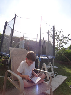 #7 Easton abandoning his fun on the trampoline to chase me down and see what books I got him. He loves anything with a comic book/graphic novel look or that's about funny kids (ie. Diary of a Wimpy Kid, Captain Underpants, Bad Kitty). He grabbed one and immediately headed for a chair on the patio to dive in!